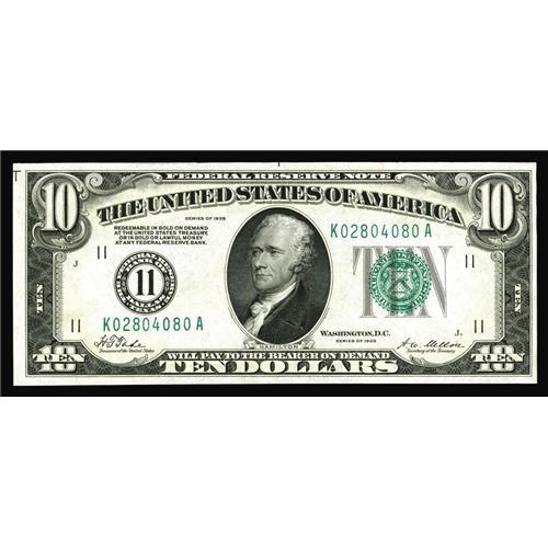 <B>Fr. 2000-K $10 1928 Federal Reserve Note. Gem Crisp Uncirculated.</B></I><BR>A gorgeous example of this very scarce note, boasting unusually bold embossing great colors, and full originality and freshness. Expect the very conservative valuation in the new Oakes catalogue of $500 to be speedily exceeded by collectors who know just how scarce these Dallas district notes are in this series.