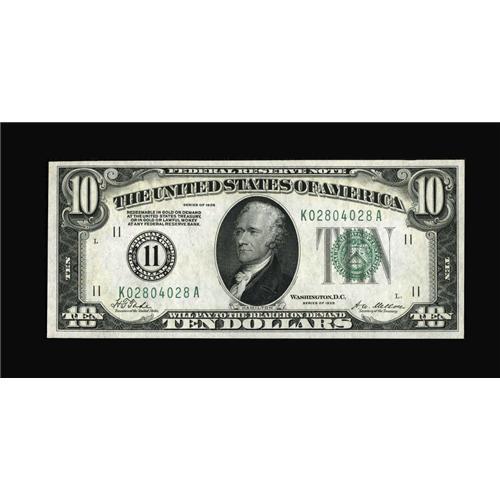 <B>Fr. 2000-K $10 1928 Federal Reserve Note. Gem Crisp Uncirculated.</B></I><BR>This rare beauty returns to us, last seen in our 2004 FUN sale, "An extremely rare note in this grade which is on the want lists of many collectors, as Dallas district examples are virtually never available this nice. This is an attractively centered and crackling fresh beauty which is certain to please."<BR><BR><b>Shipping:</b> Coins & Currency (<a target="_blank" href="http://www.heritageauctions.com/common/shipping.php">view shipping information</a>)