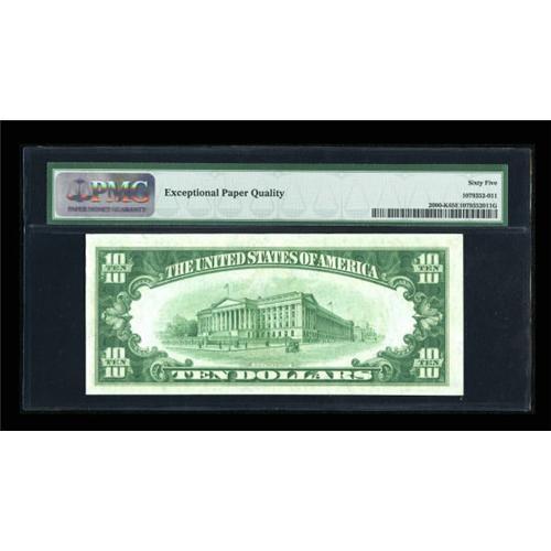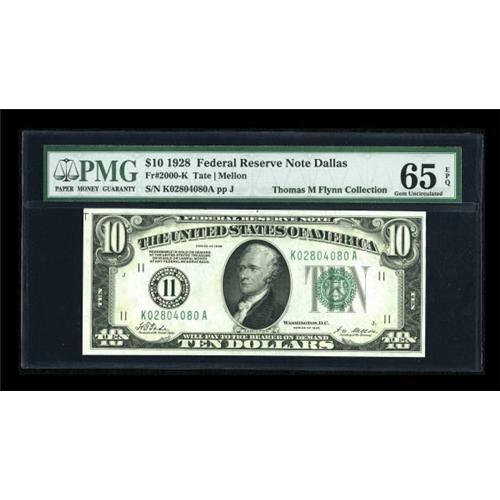 <B>Fr. 2000-K $10 1928 Federal Reserve Note. PMG Gem Uncirculated 65 EPQ.</B></I><BR> This is likely the scarcest district in this series, with Gem examples few and far between. PMG has graded just two to date, this 65 and one 66. <BR><I>From The Thomas M. Flynn Collection</B></I><BR><BR><b>Shipping:</b> Coins & Currency (<a target="_blank" href="http://www.heritageauctions.com/common/shipping.php">view shipping information</a>)