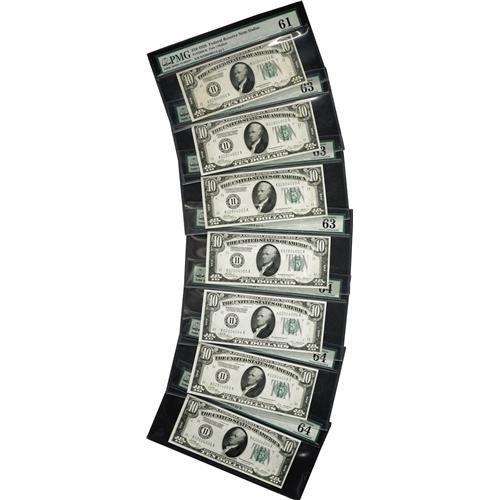 <B>Fr. 2000-K $10 1928 Federal Reserve Notes. Seven Examples.</B></I><BR>These seven notes, with the first five consecutive, have been third-party graded. They carry these grades in their serial number order <B>PMG Uncirculated 61; Choice Uncirculated 63EPQ; Choice Uncirculated 63EPQ; Choice Uncirculated 64EPQ; Choice Uncirculated 63EPQ; Choice Uncirculated 64EPQ; and Choice Uncirculated 64EPQ..</B></I> The second note has the added comment, "as made paper flaw lower left corner."<BR><BR><b>Shipping:</b> Coin/Currency (<a target="_blank" href="http://www.heritageauctions.com/common/shipping.php">view shipping information</a>)