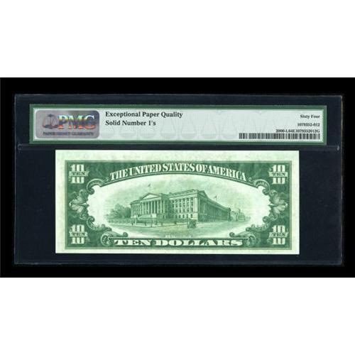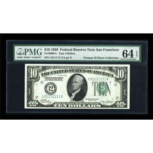 <B>Fr. 2000-L $10 1928 Federal Reserve Note. PMG Choice Uncirculated 64 EPQ.</B></I><BR> Tom did not pursue fancy numbers per se, but he certainly acquired a fair number of them during a forty year collecting journey. This note bears fancy serial number L01111111A.<BR><I>From The Thomas M. Flynn Collection</B></I><BR><BR><b>Shipping:</b> Coins & Currency (<a target="_blank" href="http://www.heritageauctions.com/common/shipping.php">view shipping information</a>)