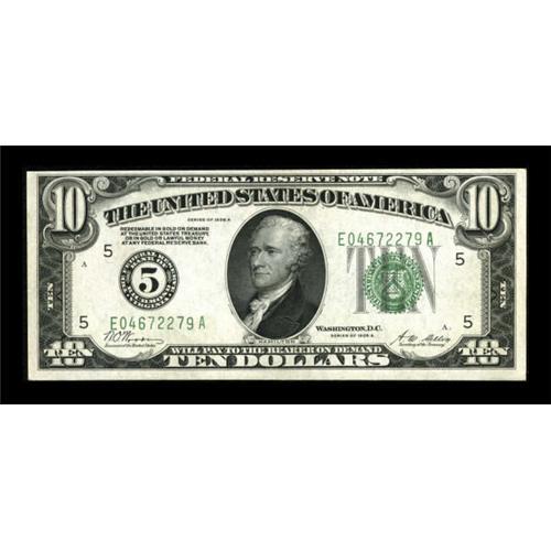 <B>Fr. 2001-E $10/5 1928A Federal Reserve Note. Crisp Uncirculated.</B></I><BR> From our Taylor Family Collection where the description read, "This is one of the scarcer double denominations with just a handful of examples recorded. It's available far less frequently than the Kansas City $5/10, and, despite its considerably higher degree of rarity will likely fetch just about the same amount by the time the hammer falls this evening." The note realized $19,550 on an estimate of $10,000-$15,000. With errors of this magnitude tightly held and rarely offered, expect a substantial increase by the time the hammer falls this afternoon.<BR><BR><b>Shipping:</b> Coins & Currency (<a target="_blank" href="http://www.heritageauctions.com/common/shipping.php">view shipping information</a>)