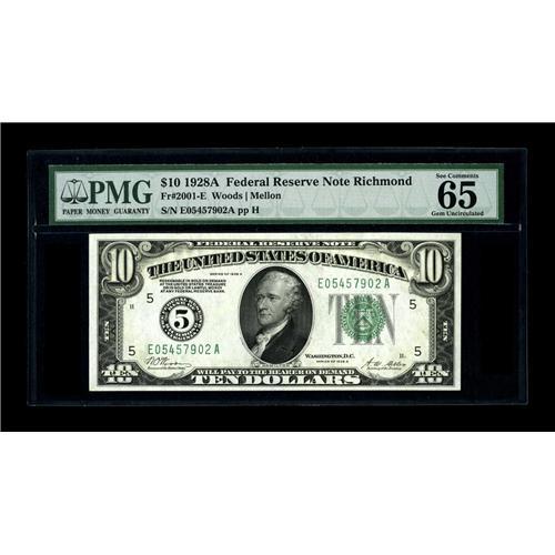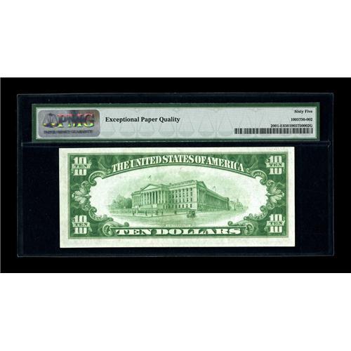<B>Fr. 2001-E $10 1928A Federal Reserve Note. PMG Gem Uncirculated 65 EPQ.</B></I><BR>Sufficient margins for Gem are noted all around this issue, though the top margin is a touch larger than the others. The paper quality lives up the the "Exceptional Paper Quality" comment on the holder. This is a challenging issue in this state of preservation.<BR><BR><b>Shipping:</b> Coin/Currency (<a target="_blank" href="http://www.heritageauctions.com/common/shipping.php">view shipping information</a>)