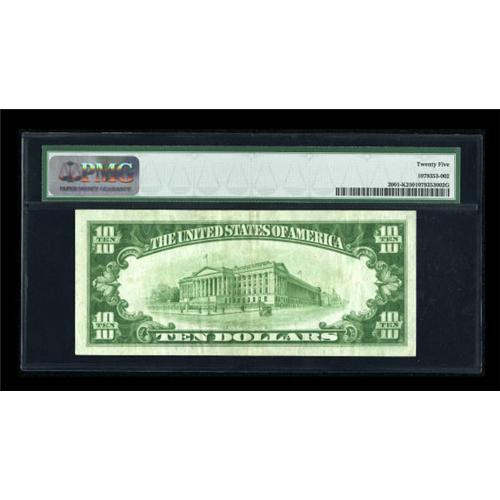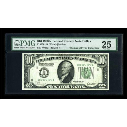 <B>Fr. 2001-K $10 1928A Federal Reserve Note. PMG Very Fine 25.</B></I><BR> Scarce, but not quite as rare as examples from Minneapolis. Still, this is one of only two Dallas district notes graded to date, with the other a Fine 15.<BR><I>From The Thomas M. Flynn Collection</B></I><BR><BR><b>Shipping:</b> Coins & Currency (<a target="_blank" href="http://www.heritageauctions.com/common/shipping.php">view shipping information</a>)