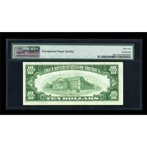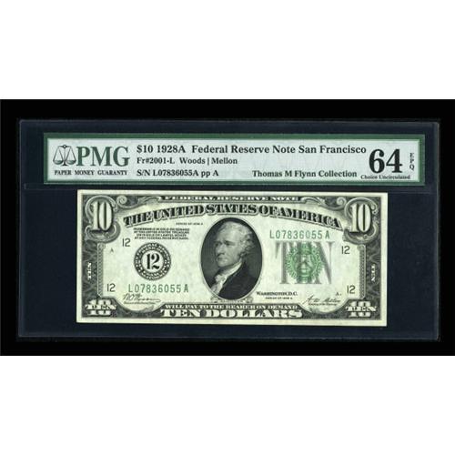 <B>Fr. 2001-L $10 1928A Federal Reserve Note. PMG Choice Uncirculated 64 EPQ.</B></I><BR> A lovely example from a tougher district in this series. <BR><I>From The Thomas M. Flynn Collection</B></I><BR><BR><b>Shipping:</b> Coins & Currency (<a target="_blank" href="http://www.heritageauctions.com/common/shipping.php">view shipping information</a>)