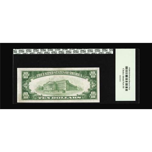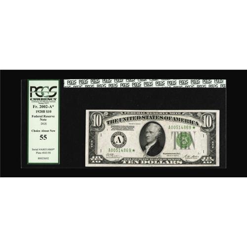 <B>Fr. 2002-A* $10 1928B DGS Federal Reserve Star Note. PCGS Choice About New 55.</B></I><BR>This note happens to be the highest serial number recorded in the latest Oakes reference. No questions that this is the dark green seal variety.