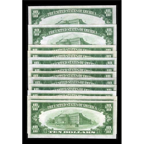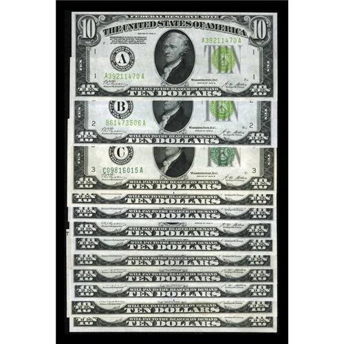 <B>Fr. 2002-A-L District Set $10 1928B Federal Reserve Notes. Crisp Uncirculated or Better.</B></I><BR> All twelve districts of this series are represented in this set. It was obviously put together with care as all of the notes exhibit nice quality. The Boston, New York, Atlanta, Chicago, and St. Louis notes are of the Light Green Seal variety while the other seven examples have the Dark Green Seal overprint.<BR><I>From The Thomas M. Flynn Collection</B></I><BR><BR><b>Shipping:</b> Coins & Currency (<a target="_blank" href="http://www.heritageauctions.com/common/shipping.php">view shipping information</a>)