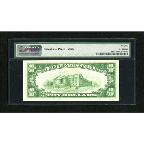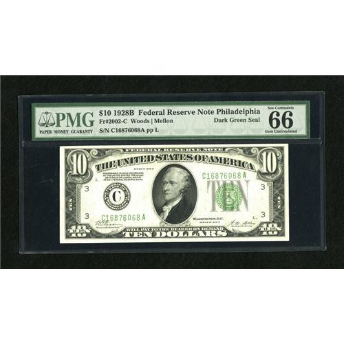 <B>Fr. 2002-C $10 1928B DGS Federal Reserve Note. PMG Gem Uncirculated 66 EPQ.</B></I><BR>Plentiful margins and radiant inks are seen on this DGS Philly note.<BR><I>From The Lincoln Collection</B></I><BR><BR><b>Shipping:</b> Coins & Currency (<a target="_blank" href="http://www.heritageauctions.com/common/shipping.php">view shipping information</a>)