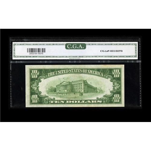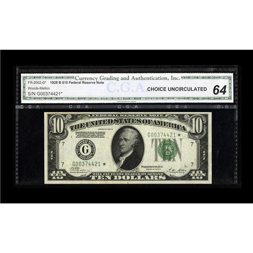 <B>Fr. 2002-G* $10 1928B Federal Reserve Note. CGA Choice Uncirculated 64.</B></I><BR>Three extra wide margins are found on this Chicago star. The top margin shows a little bit of aging near the upper left-hand corner.<BR><BR><b>Shipping:</b> Coin/Currency (<a target="_blank" href="http://www.heritageauctions.com/common/shipping.php">view shipping information</a>)
