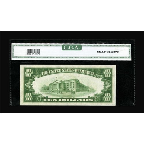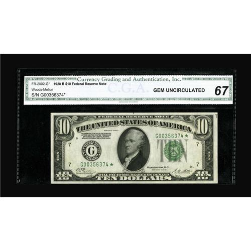 <B>Fr. 2002-G* $10 1928B Federal Reserve Note. CGA Gem Uncirculated 67.</B></I><BR>The margins are nearly perfect as is the front to back centering. The bright white paper contrasts nicely against the deep, dark green seal and serial numbers. Though stars were issued for nearly all the districts in this issue, the printing totals of only the Kansas City and Atlanta districts were released.<BR><BR><b>Shipping:</b> Coins & Currency (<a target="_blank" href="http://www.heritageauctions.com/common/shipping.php">view shipping information</a>)