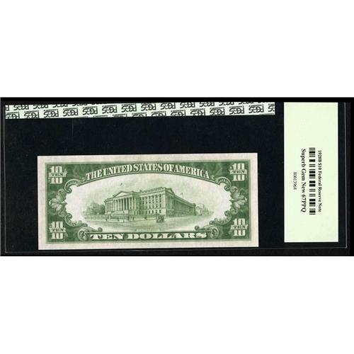<B>Fr. 2002-G* $10 1928B Federal Reserve Note. PCGS Superb Gem New 67PPQ.</B></I><BR>The margins all around are nearly identical and perfectly center the design on the bold crisp paper.