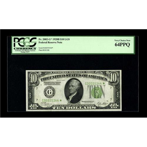 <B>Fr. 2002-G* $10 1928B LGS Federal Reserve Note. PCGS Very Choice New 64PPQ.</B></I><BR>Beautifully printed, crackling fresh, and utterly original, in short, an early star note fit for the finest of collections.<BR><I>From The Bill and Kathy Stella Currency Collection</B></I><BR><BR><b>Shipping:</b> Coin/Currency (<a target="_blank" href="http://www.heritageauctions.com/common/shipping.php">view shipping information</a>)