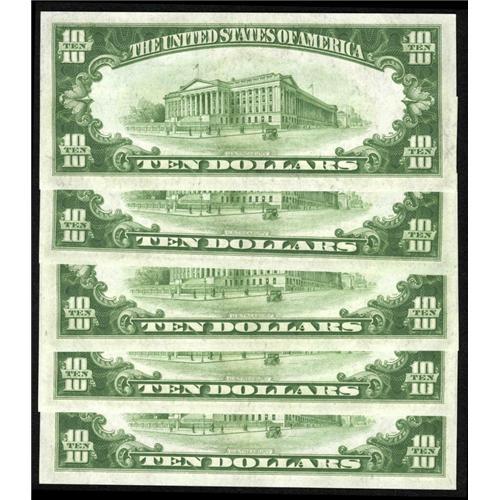 <B>Fr. 2002-G $10 1928B Federal Reserve Notes. Gem Crisp Uncirculated.</B></I><BR>A virtually flawless group of five consecutive notes with the popular "redeemable in gold" obligation. Pack fresh and with their full original snap. Free from even a hint of the slightest distraction.