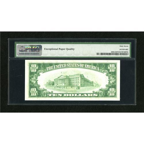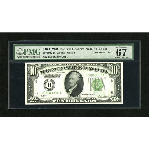 <B>Fr. 2002-H $10 1928B DGS Federal Reserve Note. PMG Superb Gem Unc 67 EPQ.</B></I><BR>Any note in a "67" or better holder is going to command a great deal of attention and we would expect nothing less from this abundantly margined and boldly embossed prize.<BR><I>From The Lincoln Collection</B></I><BR><BR><b>Shipping:</b> Coins & Currency (<a target="_blank" href="http://www.heritageauctions.com/common/shipping.php">view shipping information</a>)