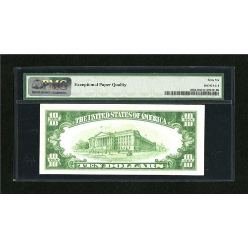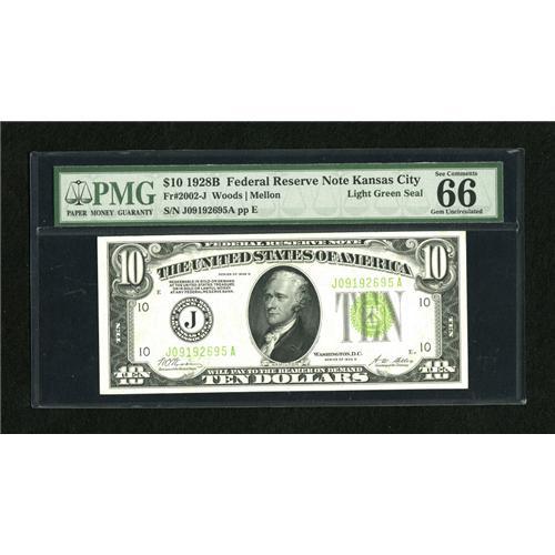 <B>Fr. 2002-J $10 1928B LGS Federal Reserve Note. PMG Gem Uncirculated 66 EPQ.</B></I><BR>A lovely example of this light green seal variety that has excellent margins and superb centering.<BR><I>From The Lincoln Collection</B></I><BR><BR><b>Shipping:</b> Coins & Currency (<a target="_blank" href="http://www.heritageauctions.com/common/shipping.php">view shipping information</a>)