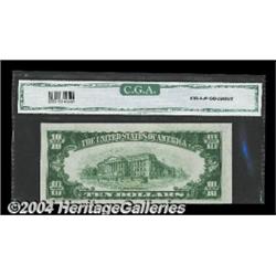 Fr. 2003-B $10 1928C Federal Reserve Note. CGA Choice Uncirculated 63.A nice third-party graded example of this much scarcer series. The New York and Chicago districts are the only two from which notes from this series are readily available. <BR><BR><B>Important notice:</B> Heritage usually auctions material at the rate of 200-250 lots per hour. On some occasions eBay Live bid software or the Internet may not be able to keep up with the pace of the auction. We recommend placing a realistic absentee bid now as insurance to avoid disappointment. Occasionally the auctioneer may eliminate or reject an eBay Live bid, and the auctioneer may also reopen a lot after the close of the eBay live bidding (usually because we missed an audience bid), and may reject your bid even if it shows you as the winning bidder. By bidding via eBay Live, you agree that Heritage may award the lot to another bidder at its sole discretion under the circumstances described above or any other reasonable circumstances. Since eBay bids are not shown to us until we open the lot on the floor, we treat those bids just like floor bids. In most cases the floor responds before the eBay bid is presented to us, due to Internet lag time, so for consistency we have made it a policy that floor bids are always considered first over tie eBay live bids. Also please note that all Heritage lots purchased through eBay Live carry a 20% Buyer's Premium. Please make sure you read the Terms and Conditions before you bid. <BR><BR><B>IMPORTANT ANNOUNCEMENT ABOUT RESERVES:</B> Heritage now divulges all reserves on its web site 7 days before every auction. If you want to know whether the reserve on this lot has been met, and if not, what the reserve amount is, please visit this lot page on the HeritageCoin.com web site, or email: bid@HeritageGalleries.com