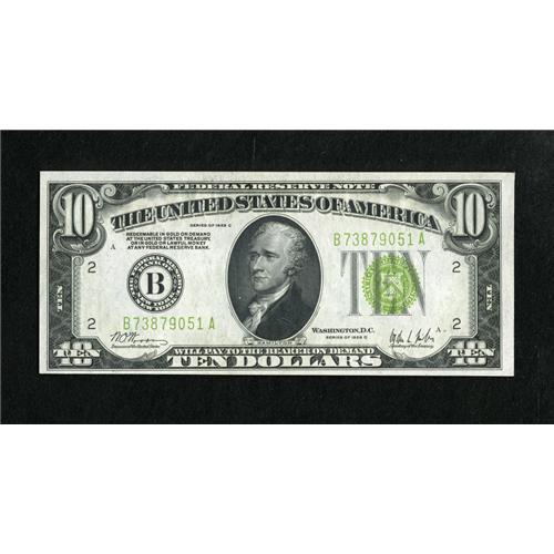<B>Fr. 2003-B $10 1928C Federal Reserve Note. Choice Crisp Uncirculated.</B></I><BR>Absolutely stunning originality and superb punch through embossing are found on this light green seal treasure. With a broader bottom margin the gem grade would jump onto the stage. The Schwartz value of $600 may well prove to be conservative.<BR><BR><b>Shipping:</b> Coins & Currency (<a target="_blank" href="http://www.heritageauctions.com/common/shipping.php">view shipping information</a>)