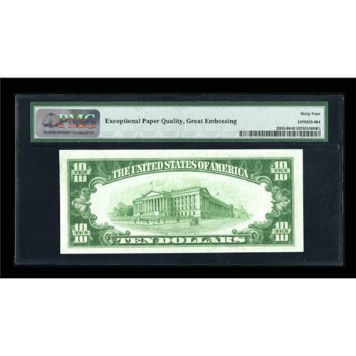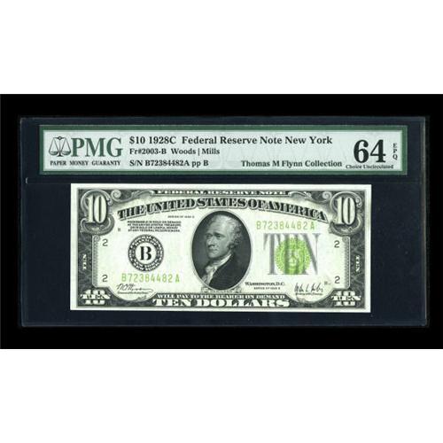 <B>Fr. 2003-B $10 1928C Federal Reserve Note. PMG Choice Uncirculated 64 EPQ.</B></I><BR> The first of a set of 1928C tens from all four of the reported districts. This EPQ note also has the notation "Great Embossing" on the holder as well. <BR><I>From The Thomas M. Flynn Collection</B></I><BR><BR><b>Shipping:</b> Coins & Currency (<a target="_blank" href="http://www.heritageauctions.com/common/shipping.php">view shipping information</a>)