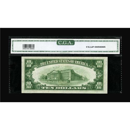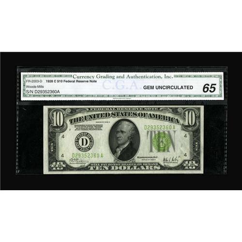 <B>Fr. 2003-D $10 1928C Federal Reserve Note. CGA Gem Uncirculated 65.</B></I><BR>A very rare note in this grade, with this piece graded and encapsulated by CGA.<BR><BR><b>Shipping:</b> Coins & Currency (<a target="_blank" href="http://www.heritageauctions.com/common/shipping.php">view shipping information</a>)