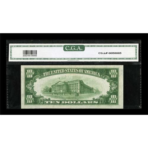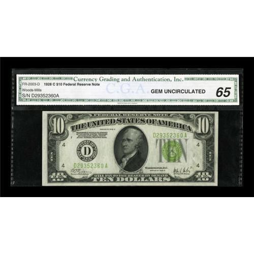 <B>Fr. 2003-D $10 1928C Federal Reserve Note. CGA Gem Uncirculated 65.</B></I><BR> Series 1928C is the key of the $10 FRNs. This piece is one of the nicest pieces available from the second scarcest of the five districts that issued notes. The light green seal is pleasing against the bright white paper.<BR><BR><b>Shipping:</b> Coins & Currency (<a target="_blank" href="http://www.heritageauctions.com/common/shipping.php">view shipping information</a>)
