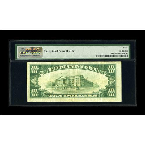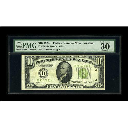 <B>Fr. 2003-D $10 1928C Federal Reserve Note. PMG Very Fine 30 EPQ.</B></I><BR>This is a moderately circulated example of the much scarcer Cleveland district of this key early date. The margins are solid with the PMG comment "Exceptional Paper Quality" and the eye appeal is also exceptional for a circulated note.<BR><BR><b>Shipping:</b> Coin/Currency (<a target="_blank" href="http://www.heritageauctions.com/common/shipping.php">view shipping information</a>)