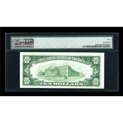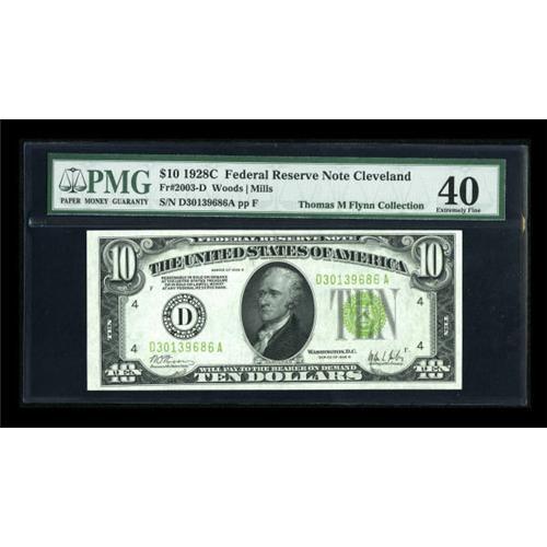 <B>Fr. 2003-D $10 1928C Federal Reserve Note. PMG Extremely Fine 40.</B></I><BR> A scarce district in all grades, with this a brightly colored example with loads of eye appeal. <BR><I>From The Thomas M. Flynn Collection</B></I><BR><BR><b>Shipping:</b> Coins & Currency (<a target="_blank" href="http://www.heritageauctions.com/common/shipping.php">view shipping information</a>)