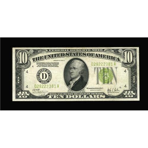 <B>Fr. 2003-D $10 1928C Federal Reserve Note. Very Fine-Extremely Fine.</B></I><BR>Second in rarity only to the extremely rare Richmond district, this 1928C $10 from Cleveland is one of the more highly sought after Fed Tens in the series. This is a pleasing example for the grade.