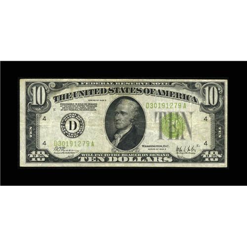 <B>Fr. 2003-D $10 1928C Federal Reserve Note. Very Fine.</B></I><BR>This is a very scarce note in any condition, with auction records for uncirculated examples reaching up into the high four figures. Expect this clean, attractive and problem free circulated piece to realize...