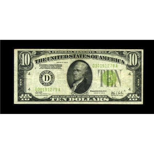 <B>Fr. 2003-D $10 1928C Federal Reserve Note. Very Fine.</B></I><BR>This is a rare note in any grade, with a new Oakes catalogue valuation of $600 in Very Fine. We would not be surprised to see this bright and problem free example exceed that figure by a considerable sum.<BR><BR><b>Shipping:</b> Coin/Currency (<a target="_blank" href="http://www.heritageauctions.com/common/shipping.php">view shipping information</a>)