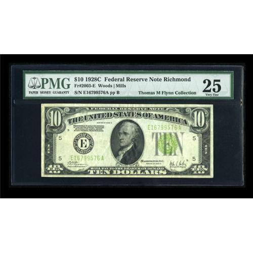 <B>Fr. 2003-E $10 1928C Federal Reserve Note. PMG Very Fine 25.</B></I><BR> Perhaps a dozen examples exist from the Richmond district, with just three graded to date by PMG. This note is rare enough to realize the full catalogue value of $3000 in Very Fine.<BR><I>From The Thomas M. Flynn Collection</B></I><BR><BR><b>Shipping:</b> Coins & Currency (<a target="_blank" href="http://www.heritageauctions.com/common/shipping.php">view shipping information</a>)