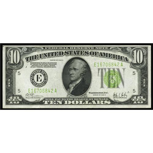 <B>Fr. 2003-E $10 1928C Federal Reserve Note. Extremely Fine.</B></I><BR>An extremely rare example from this seldom seen issue. We have only had the chance to offer an Uncirculated example back in our Taylor Family offering from February 2005, where that note brought $9,200. Which collection will this rarity join?