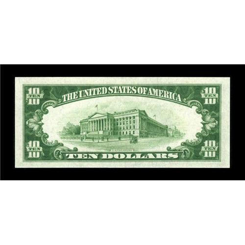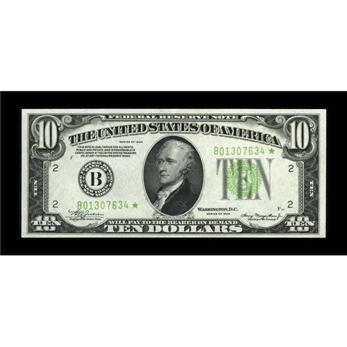 <B>Fr. 2004-B* $10 1934 Federal Reserve Note. Choice About Uncirculated.</B></I><BR>Decent margins surround this monstrously embossed replacement note. The colors are very bright and the surfaces quite crisp.<BR><BR><b>Shipping:</b> Coin/Currency (<a target="_blank" href="http://www.heritageauctions.com/common/shipping.php">view shipping information</a>)
