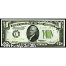 <B>Fr. 2004-F* $10 1934 Light Green Seal Federal Reserve Note. Choice Crisp Uncirculated.</B></I><BR>Gem from the standpoint of originality and freshness, but with some very trivial handling. This note bears a serial just one digit lower than the highest recorded from the district. Lot:16019