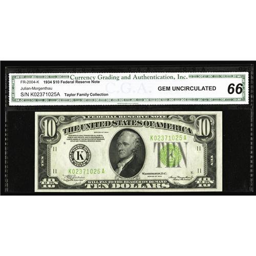 <B>Fr. 2004-K $10 1934 Federal Reserve Note. CGA Gem Uncirculated 66.</B></I><BR>This example from the Taylor family Collection is only 20 notes removed from the highest serial known in Oakes. Vibrant inks dazzle the eyes.