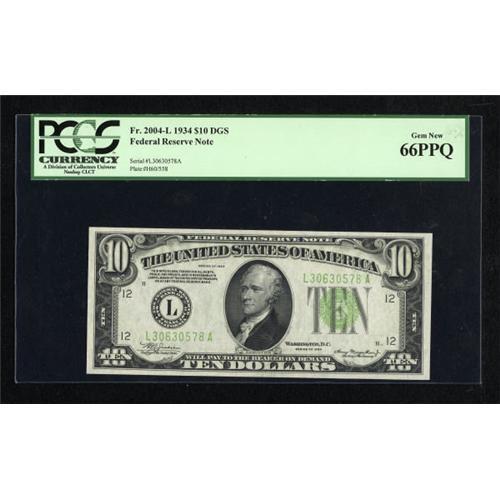 <B>Fr. 2004-L $10 1934 Federal Reserve Note. PCGS Gem New 66PPQ.</B></I><BR> This $10 is broadly margined and it sports natural paper wave.<BR><BR><b>Shipping:</b> Coins & Currency (<a target="_blank" href="http://www.heritageauctions.com/common/shipping.php">view shipping information</a>)