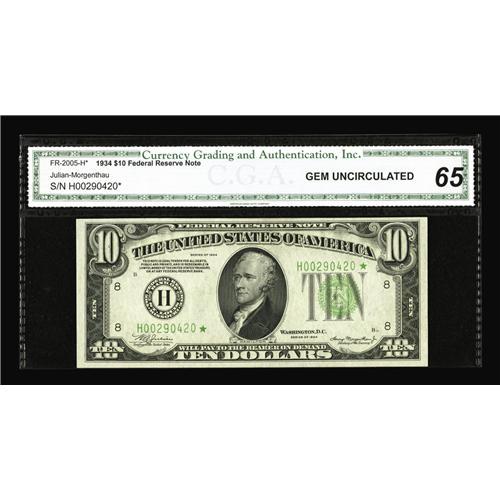 Fr. 2005-H* $10 1934 Federal Reserve Note. CGA Gem 65 Fr. 2005-H* $10 1934 Federal Reserve Note. CGA