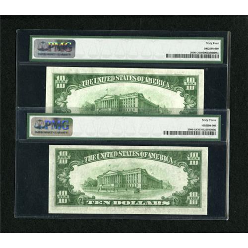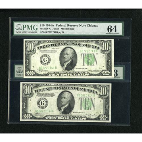 <B>Fr. 2006-G $10 1934A Federal Reserve Notes. Two Examples PMG Choice Uncirculated 63 & 64.</B></I><BR> Here is a pair of pack fresh examples from the Chicago district.<BR><BR><b>Shipping:</b> Coins & Currency (<a target="_blank" href="http://www.heritageauctions.com/common/shipping.php">view shipping information</a>)
