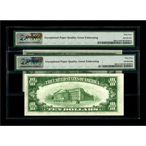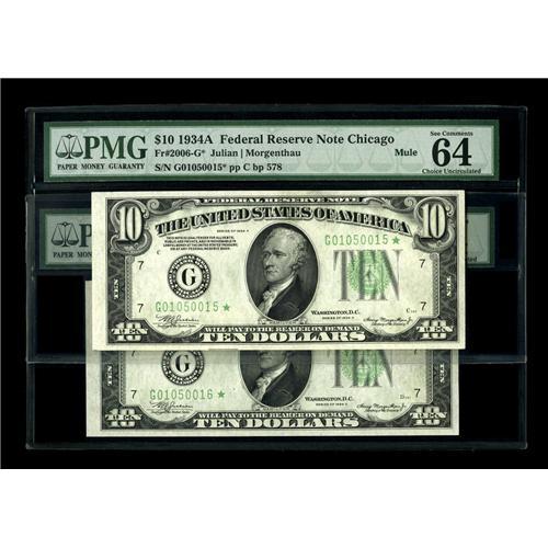 <B>Fr. 2006-G* $10 1934A Mule Federal Reserve Notes. Two Consecutive Examples PMG Choice Uncirculated 64 EPQ.</B></I><BR>This is an extremely scarce early star mule pair that rarely makes appearance either at auction or in dealer price lists. These notes have very broad margins with crisp paper and lovely paper surfaces as commented on by PMG as "Great Embossing". The highest serial number known shown in the Oakes & Schwartz tome has now been eclipsed. Expect to see spirited bidding before the hammer finally falls as these will make a nice addition to any specialized small size collection.<BR><BR><b>Shipping:</b> Coin/Currency (<a target="_blank" href="http://www.heritageauctions.com/common/shipping.php">view shipping information</a>)