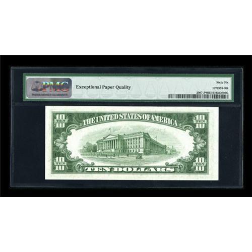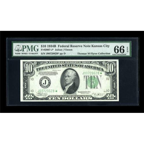 <B>Fr. 2007-J* $10 1934B Federal Reserve Note. PMG Gem Uncirculated 66 EPQ.</B></I><BR> A lovely example which is the only 1934B Kansas City star graded to date. <BR><I>From The Thomas M. Flynn Collection</B></I><BR><BR><b>Shipping:</b> Coins & Currency (<a target="_blank" href="http://www.heritageauctions.com/common/shipping.php">view shipping information</a>)