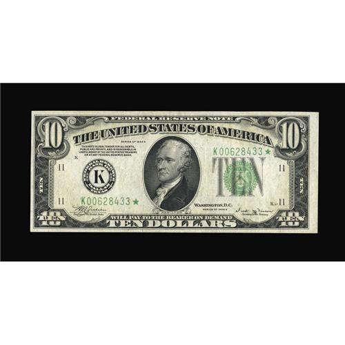 <B>Fr. 2007-K* $10 1934B Federal Reserve Note. Crisp Uncirculated.</B></I><BR>This is the first appearance for this Friedberg with us in the last five years. A hard teller counting mark along Hamilton's head accounts for the grade on this bright piece.<BR><BR><b>Shipping:</b> Coins & Currency (<a target="_blank" href="http://www.heritageauctions.com/common/shipping.php">view shipping information</a>)