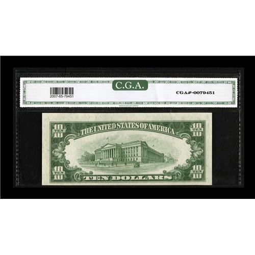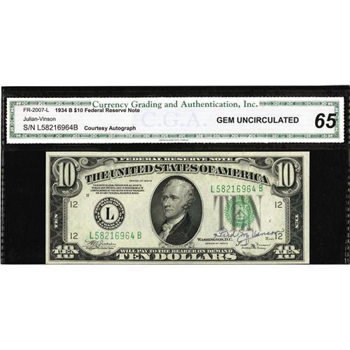 <B>Fr. 2007-L $10 1934B Federal Reserve Note. CGA Gem Uncirculated 65.</B></I><BR>This pleasing FRN boasts the Courtesy Autograph of Fred M. Vinson, Secretary of the Treasury from July 1945 to July 1946. Vinson courtesy autographs are actually quite scarce, with only one appearance in our auctions in the last five plus years. The signature remains strong and unsmeared.