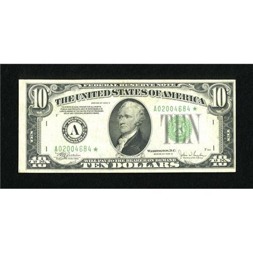<B>Fr. 2008-A* $10 1934C Federal Reserve Note. Extremely Fine.</B></I><BR>Some light folds are found on this attractive Boston star.<BR><BR><b>Shipping:</b> Coins & Currency (<a target="_blank" href="http://www.heritageauctions.com/common/shipping.php">view shipping information</a>)