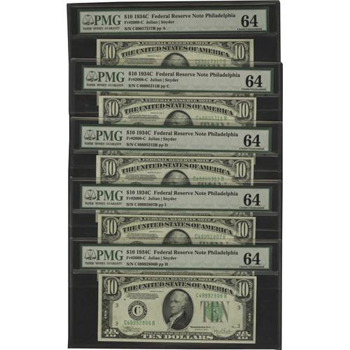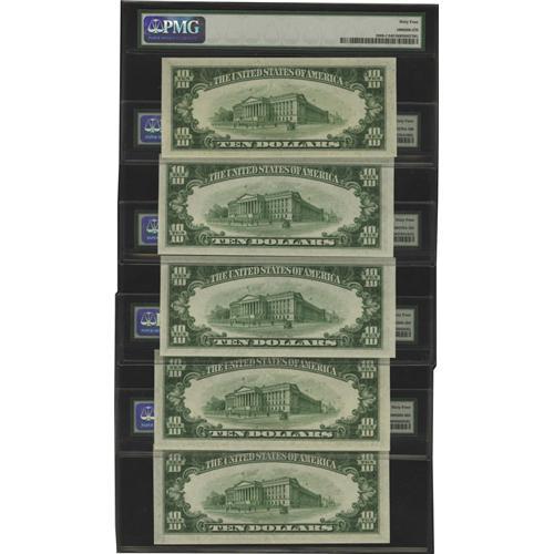 <B>Fr. 2008-C $10 1934C Federal Reserve Notes. Five Examples. PMG Choice Uncirculated 64.</B></I><BR> This quintet of notes has a couple of consecutive notes with a bonus note.<BR><BR><b>Shipping:</b> Coins & Currency (<a target="_blank" href="http://www.heritageauctions.com/common/shipping.php">view shipping information</a>)