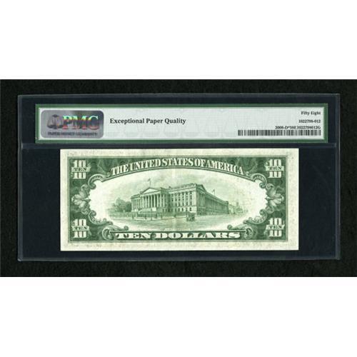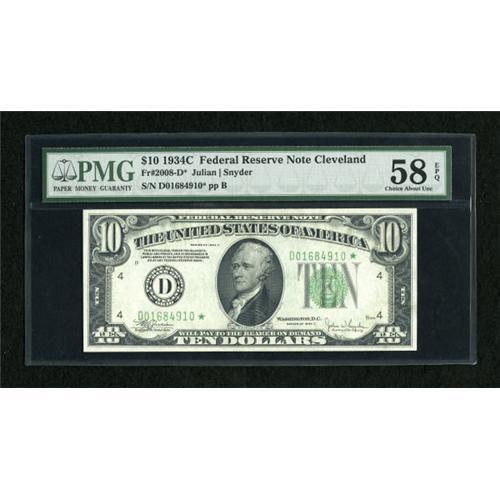 <B>Fr. 2008-D* $10 1934C Federal Reserve Note. PMG Choice About Unc 58 EPQ.</B></I><BR> A single centerfold is seen on this broadly margined and well embossed Cleveland star.<BR><BR><b>Shipping:</b> Coins & Currency (<a target="_blank" href="http://www.heritageauctions.com/common/shipping.php">view shipping information</a>)