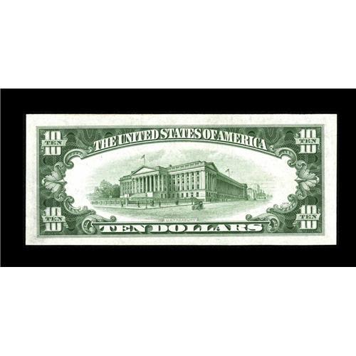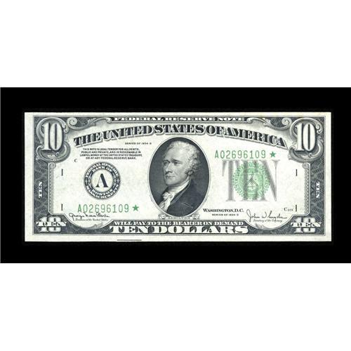 <B>Fr. 2009-A* $10 1934D Federal Reserve Note. Choice Crisp Uncirculated.</B></I><BR>It has been a while since we have offered a note of this type in one of our auctions. Well margined and crisp, this bright example should fit nicely in a small size type collection. This note becomes the lowest serial number recorded in the Oakes tome.<BR><BR><b>Shipping:</b> Coin/Currency (<a target="_blank" href="http://www.heritageauctions.com/common/shipping.php">view shipping information</a>)
