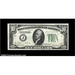 Fr. 2009-J* $10 1934D Federal Reserve Note. Gem Crisp Uncirculated.A beautiful example from this very rare series for stars. Even the massive Burnside collection lacked any 1934D $10 Fed star because they were never available in the grade he sought. This is a note he would have liked. Bright and fully embossed Gem Crisp Uncirculated, with the back centering a bit shifted but by no means by enough to remove this example from the gem class. Important notice: We expect to be auctioning lots at the rate of 200-250 per hour. Sometimes eBay Premier live bid software cannot keep up with that pace, so we strongly recommend that you place a realistic proxy bid now as insurance to avoid disappointment. Also please note that all Heritage/CAA lots purchased through eBay Premier carry a 20% Buyer's Premium. Please make sure you read the Terms and Conditions.