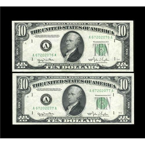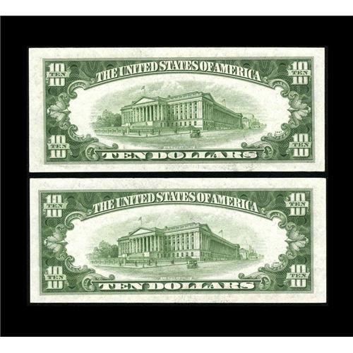 <B>Fr. 2010-A $10 1950 Federal Reserve Notes. Narrow/Wide Changeover Pair Very Choice Crisp Uncirculated.</B></I><BR>The Narrow variety carries back Plate 1447 and the Wide note carries Back Plate 1288. Both examples are pack fresh with vivid inks. In the Oakes reference no mention is made of a $10 COP of this type.
