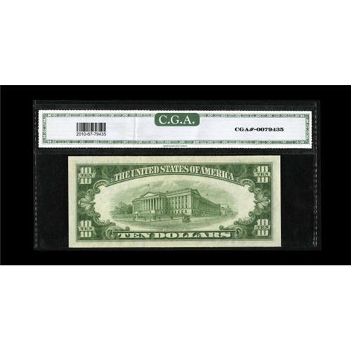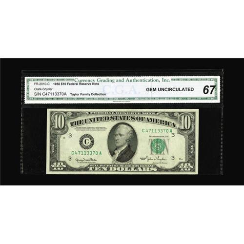 <B>Fr. 2010-C $10 1950 Federal Reserve Note. CGA Gem Uncirculated 67.</B></I><BR>A well margined Narrow variety note from the Taylor Family Collection.