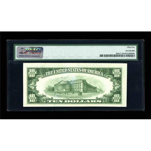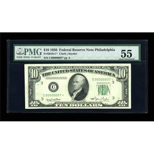 <B>Fr. 2010-C* $10 1950 Federal Reserve Note. PMG About Uncirculated 55.</B></I><BR> Two light folds are noted on this low Serial Number 7 issue. It is interesting to see two very low number star $10s in this auction.<BR><BR><b>Shipping:</b> Coins & Currency (<a target="_blank" href="http://www.heritageauctions.com/common/shipping.php">view shipping information</a>)