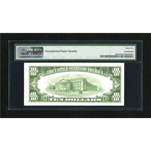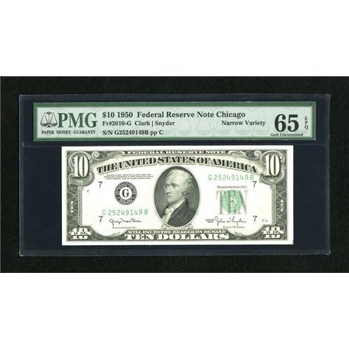 <B>Fr. 2010-G $10 1950 Narrow Federal Reserve Note. PMG Gem Uncirculated 65 EPQ.</B></I><BR>A stunning and original example of this much scarcer Narrow variety that lists for $150 in Schwartz.<BR><I>From The Bill and Kathy Stella Currency Collection</B></I><BR><BR><b>Shipping:</b> Coins & Currency (<a target="_blank" href="http://www.heritageauctions.com/common/shipping.php">view shipping information</a>)
